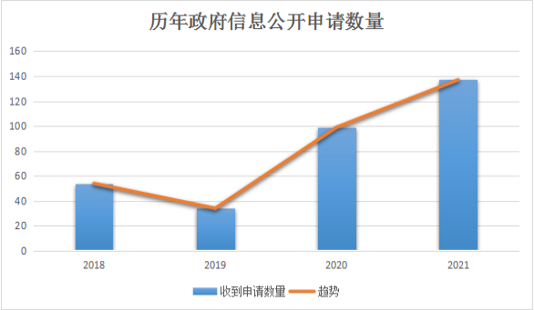 2021年沂源县人民政府共受理政府信息公开申请137件,较去年受理数量增长了38.4%,申请内容主要集中在土地征收、补偿安置等领域,均在法定期限内予以答复。