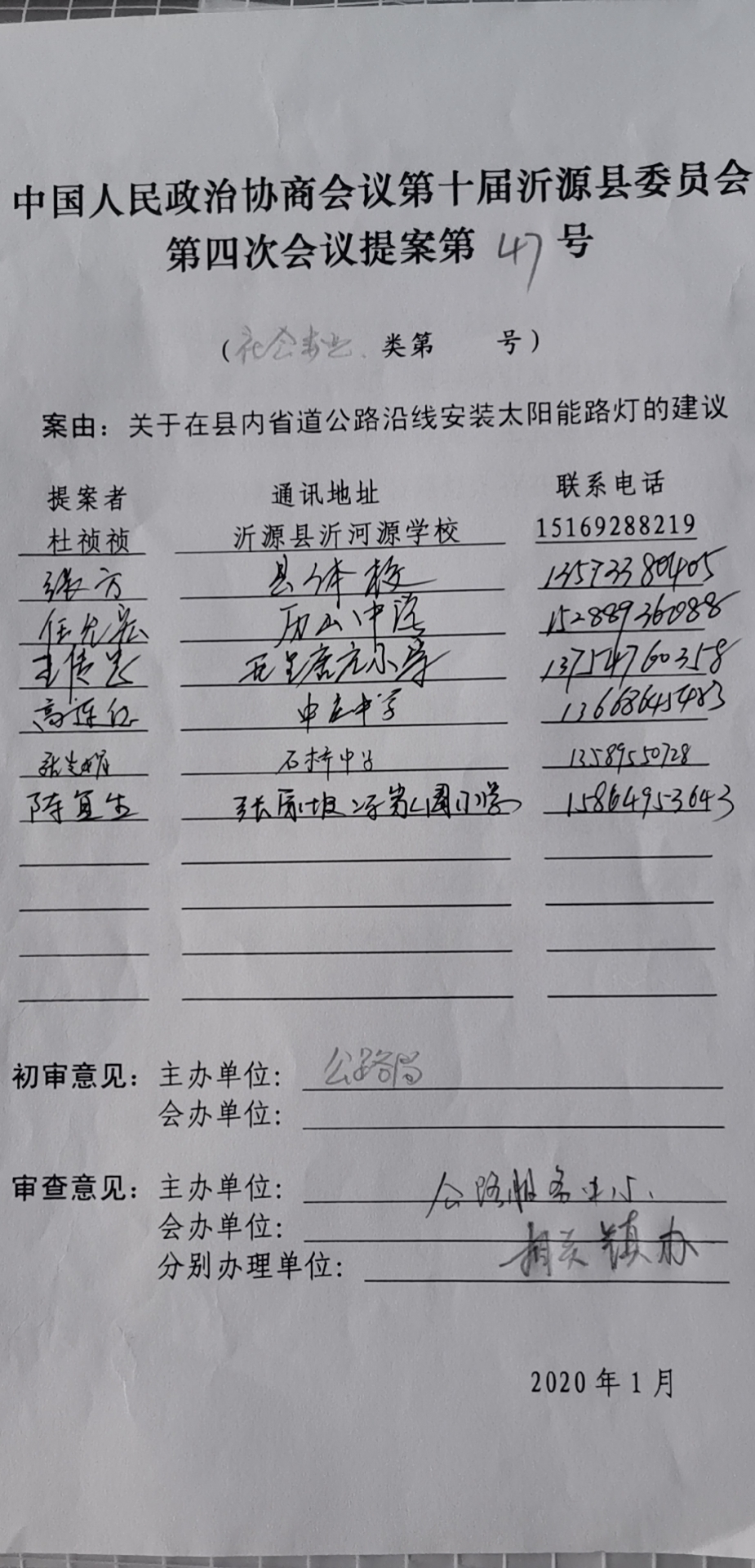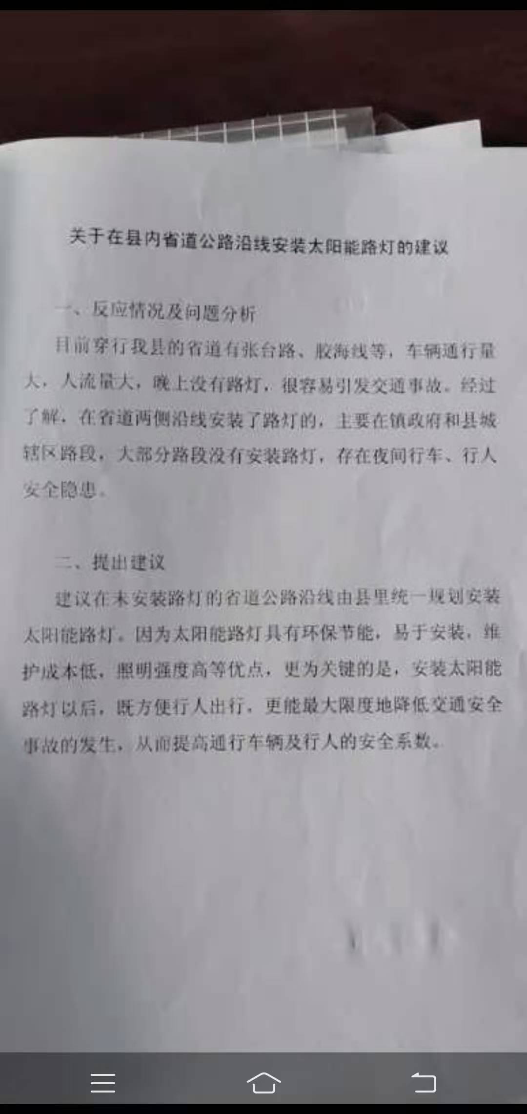 你们提出的《关于在县内省道公路沿线安装太阳能路灯的建议》的提案收悉,现答复如下: