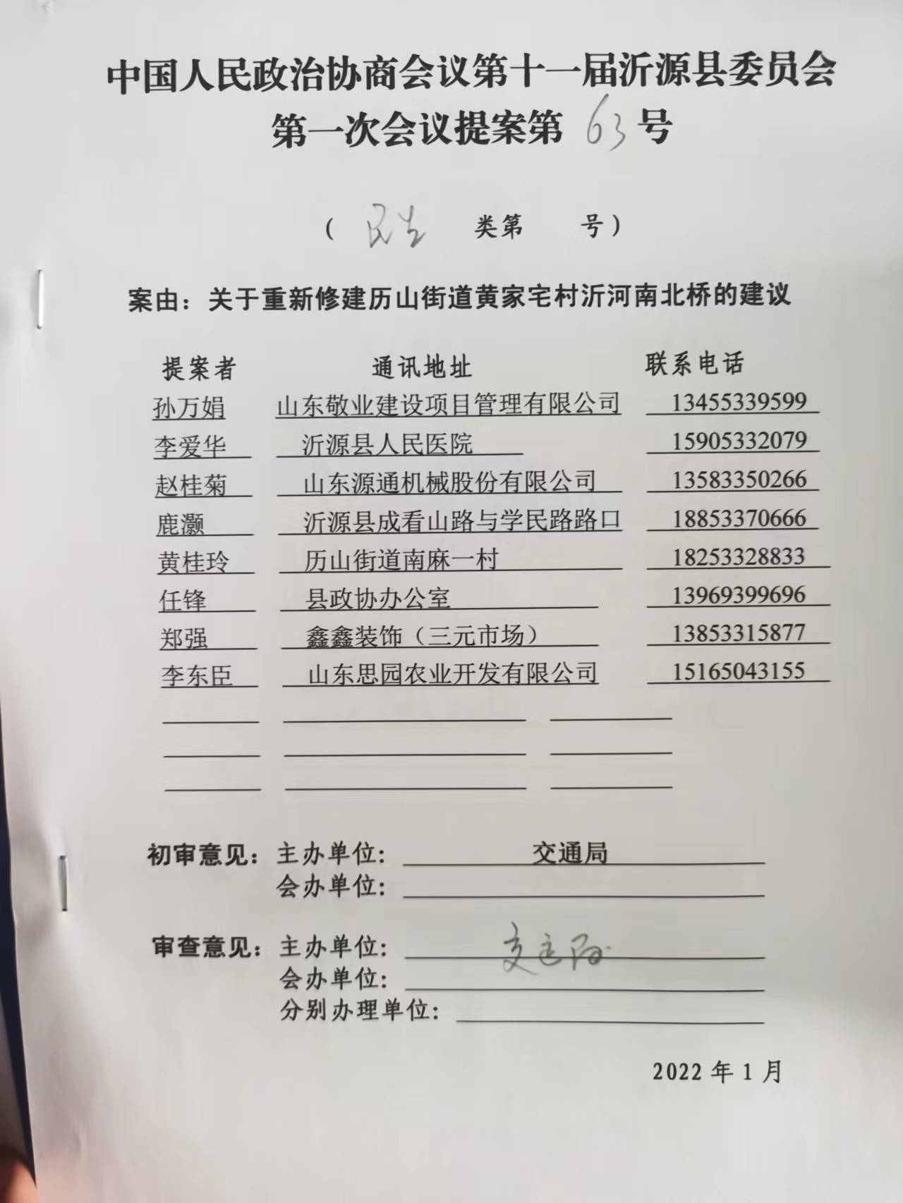 对县政协十一届一次会议委员第63号提案(重新修建历山街道黄家宅村沂河南北桥的建议)的答复