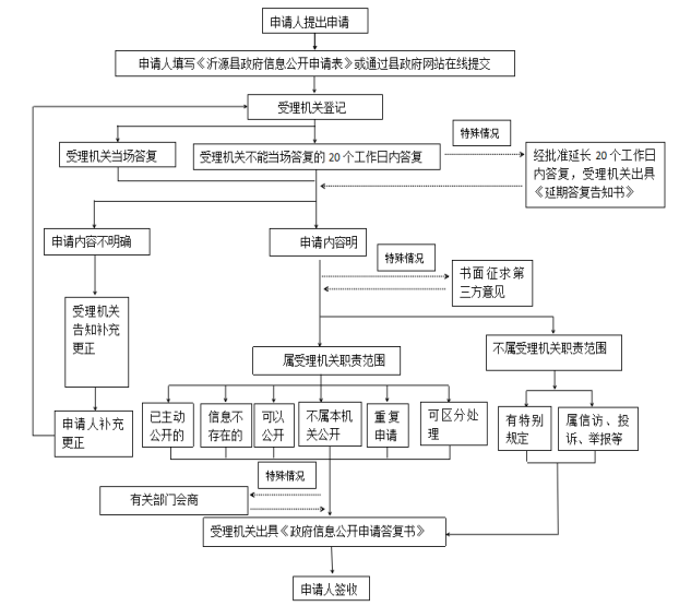 本机关办理申请人政府信息公开申请时,能够当场答复的,将当场答复;不能当场答复的,自收到申请之日起20个工作日内予以答复;确需延长答复期限的,延长答复时间不超过20个工作日,并告知申请人。政府信息涉及第三方权益的,应当征求第三方的意见,征求第三方意见所需时间不计算在期限内。