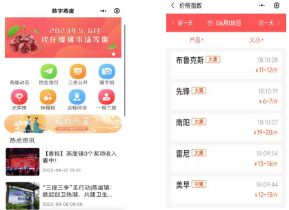 为服务镇域大樱桃主导产业发展,有效管理专业营销市场,方便客商、果农果品交易,系统率先启用了“数字市场”板块,设置了供求信息发布、价格指数参考和疫情防控登记三个模块。一是有效引导分散交易。大樱桃客商和果农均可通过微信小程序发布采购、供应信息,通过线上平台进行快速沟通磋商。燕崖镇成立信息采集小组,采集员每日收集樱桃价格信息,每天两次发布官方参考价格,一方面实现了交易公开透明,另一方面引导了市场分散交易,有效避免了交通拥堵和安全隐患发生。2023年市场物流发货量约占大樱桃交易总量的30%,同比下降20个百分点。
