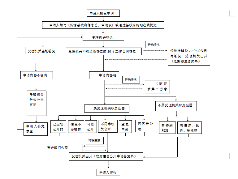 本机关办理申请人政府信息公开申请时,能够当场答复的,将当场答复;不能当场答复的,自收到申请之日起20个工作日内予以答复;确需延长答复期限的,延长答复时间不超过20个工作日,并告知申请人。政府信息涉及第三方权益的,应当征求第三方的意见,征求第三方意见所需时间不计算在期限内。