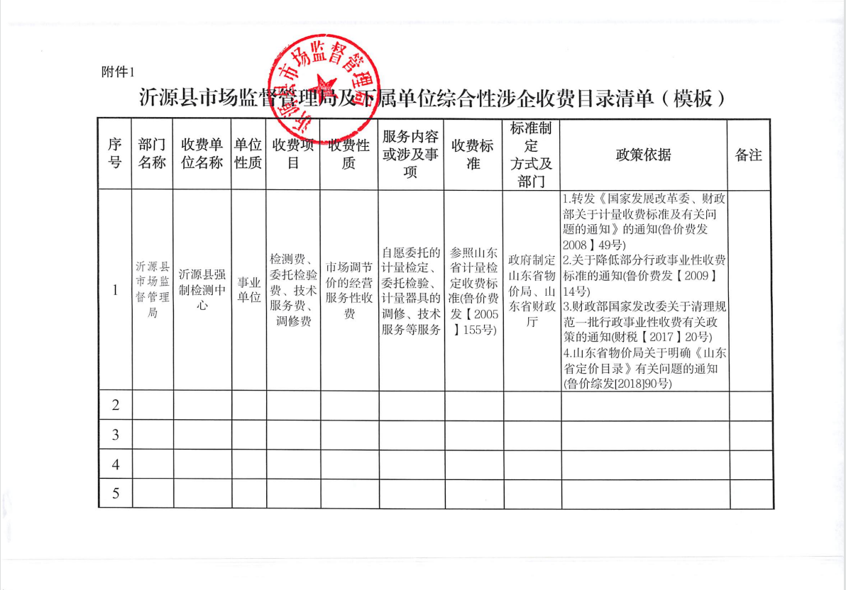 沂源县市场监督管理局及下属单位综合性涉企收费目录清单
