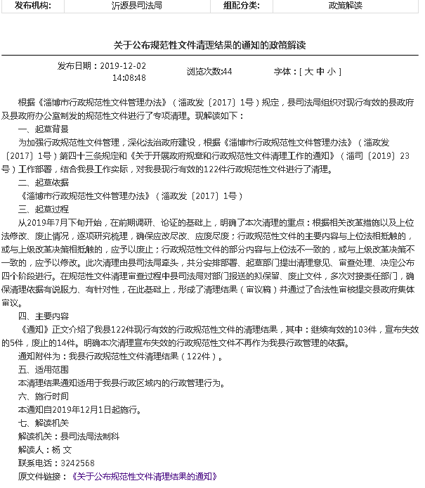2、做好规范性文件信息公开。县司法局在机构改革后,承担全县规范性文件规范、备案、审核和起草等职能,根据县政府和有关文件的要求,加强对规范性文件公开的力度和审核,确保涉及社会、群众重大利益的文件及时公开、让群众知晓。同时,做好涉民生类、重大利益类规范性文件的政策解读工作,确保做到文件与解读相互链接,群众可以自由切换。