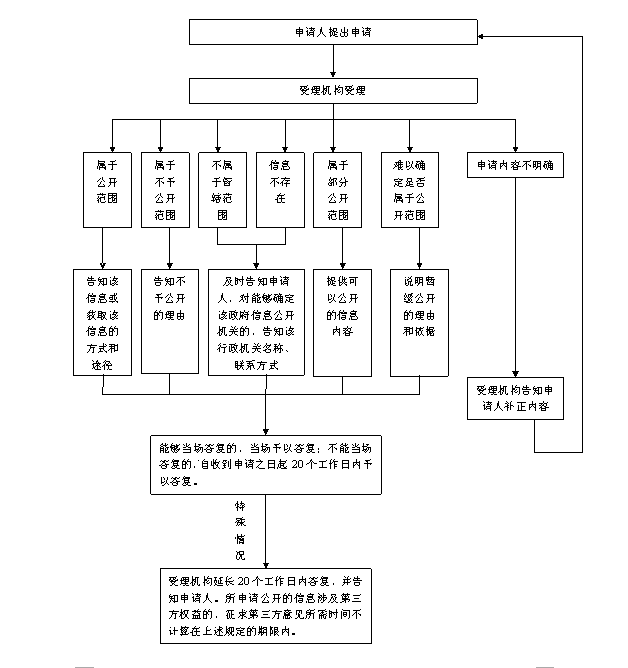 本机关办理申请人政府信息公开申请时,能够当场答复的,将当场答复;不能当场答复的,自收到申请之日起20个工作日内予以答复;确需延长答复期限的,延长答复时间不超过20个工作日,并告知申请人。政府信息涉及第三方权益的,应当征求第三方的意见,征求第三方意见所需时间不计算在期限内。