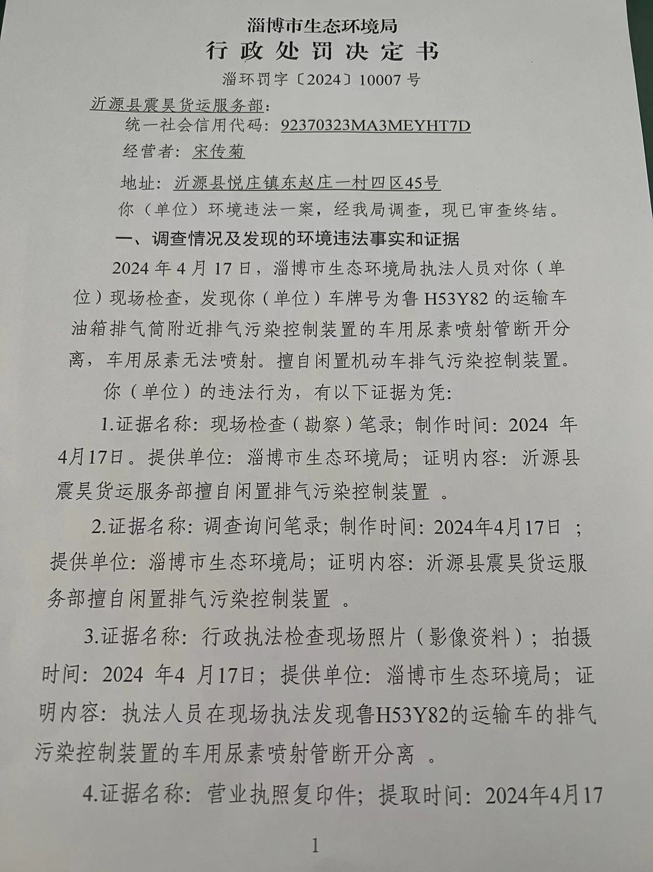 环境行政处罚信息:沂源县震昊货运服务部擅自闲置机动车排气污染控制装置