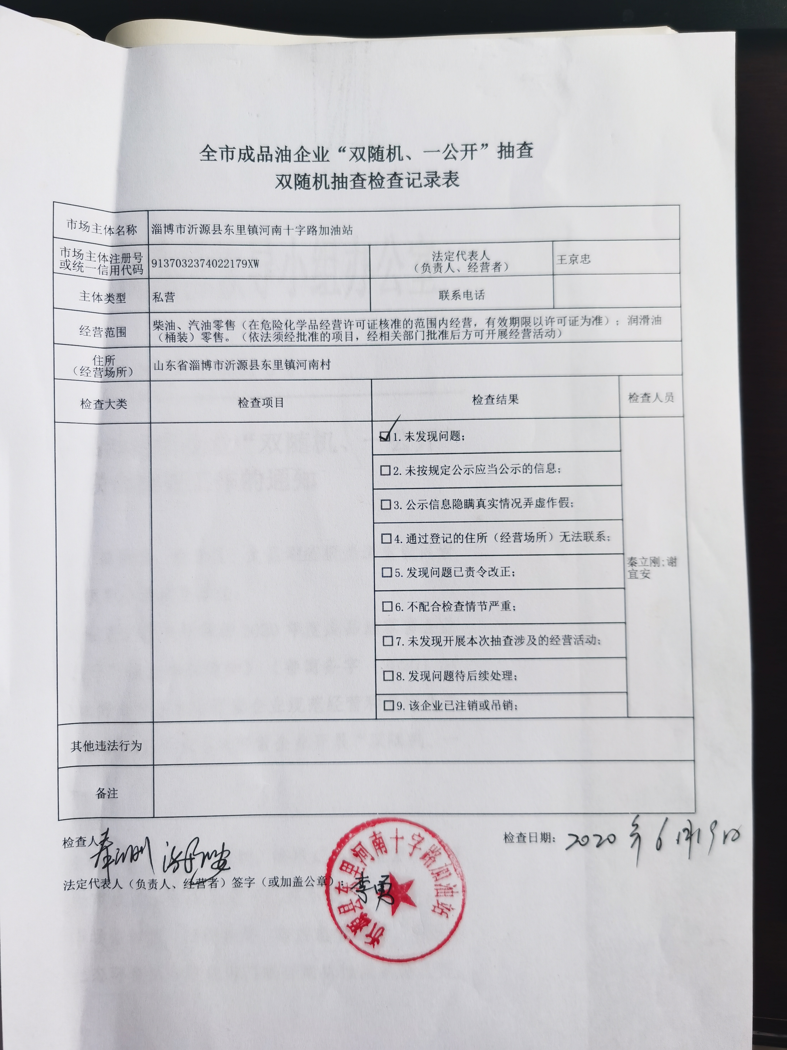 主要对企业的《成品油零售经营批准证书》《营业执照》《危险化学品经营许可证》 《税务登记证书》、成品油购进台账建立情况、国VI标准车用汽(柴)油的进货发票、地下油罐防渗改造情况、水冲厕所建设维护情况、散装汽油销售管控规定执行情况、企业在质量、计量、消防、安全、环保、税收等方面是否存在违法、违规情况进行了检查,检查结果未发现问题。