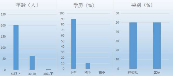 经过调查摸底,目前,全县具有一定文艺爱好和艺术特长乡土文化人才约270人。主要特点:一是涉及门类广。调查到的乡土文化人才涉及乐器演奏、表演、文艺创作、书法、舞蹈、绘画、雕刻(泥塑、面塑)、摄影等10余种门类。二是乡土气息浓。创作表演的节目内容、形式具有乡土气息、灵活多变,语言通俗易懂、易于接受,能与群众产生共鸣。表演内容以传统戏曲为主,同时包括结合新政策进行的一些文艺创作,能够通过通俗易懂的方式传播党的好政策和农村新变化。三是重自娱自乐。乡土文化传播以个人兴趣爱好为基础,主要以传统样板戏表演为主,约占50%以上,能够通过师承方式进行传播,在传统文化的传承发展上起到了很好的作用。习惯于在本村文化广场开展文艺活动,群众之间较为熟悉,容易产生互动和共鸣,娱乐性较强,能够丰富基层群众的文化生活。四是年龄大学历低。50岁以上203人,占75.2%。30-50岁64人,占23.6%。30岁以下3人,仅占1.2%。调查摸底的人中90%以上的只有小学文化,初中学历的仅有10%。