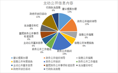 2022年,累计主动公开政府信息16条,其中,建议提案办理2条,政务公开组织领导2条,信息公开指南1条,信息公开年度报告1条,政务公开培训3条,政务公开工作推进1条,主动公开基本目录1条,基层政务公开事项标准目录1条,法治建设专栏1条,政府开放日活动2条,行政执法信息1条。
