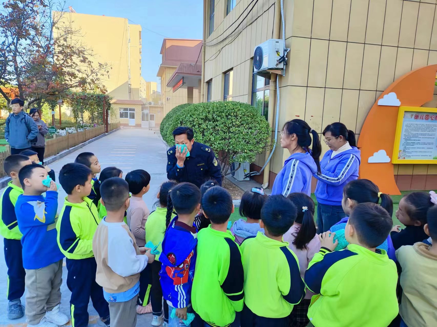 最后,学校开展了火场逃生应急疏散演练,以提高师生在危险面前的反应能力及快速逃生的应变能力。当哨声响起后,老师迅速行动,在维持好秩序的同时,指导小朋友们弯腰低头,尽量将身体放低,用湿毛巾捂住口鼻,一条队伍扶着楼梯,一条队伍扶着墙,中间留出消防通道,沿着孩子们熟悉的逃生路线快速有序地撤离到安全地带。整个过程安全有序、符合实际、达到了预期效果。