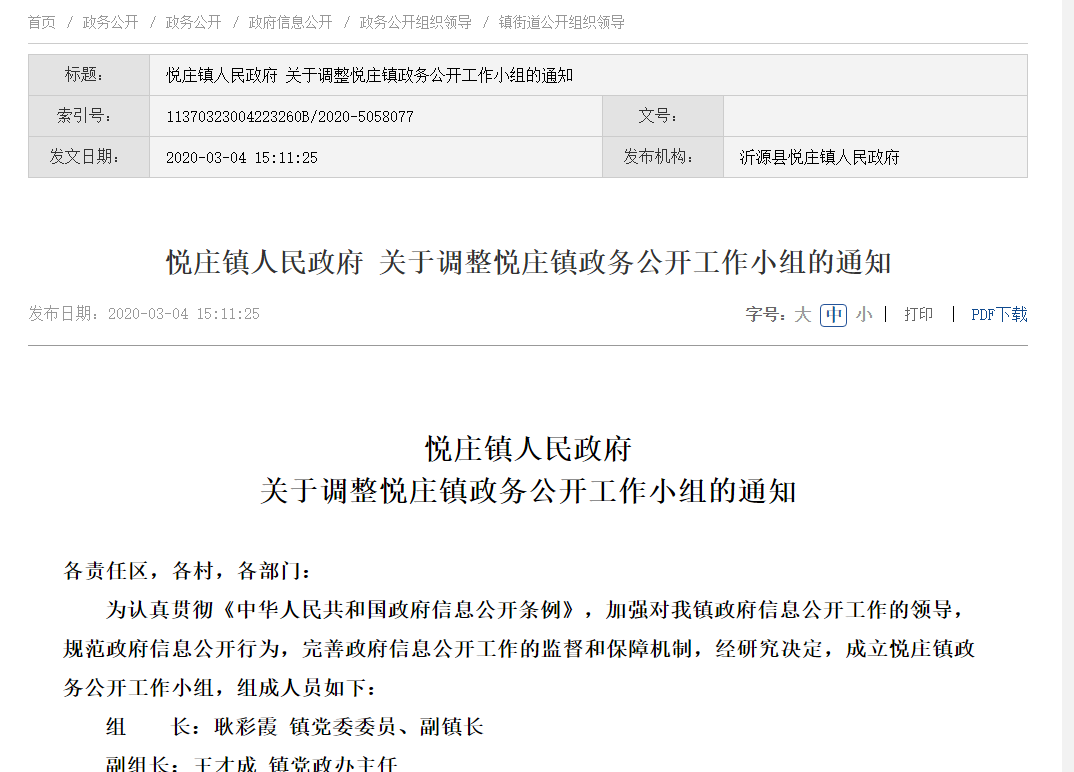 2025年,沂源县悦庄镇人民政府深入贯彻落实上级关于政务公开工作的决策部署,紧紧围绕全镇中心工作和群众关切,持续深化公开内容,优化公开平台,完善公开机制,着力提升基层政务公开标准化规范化水平。