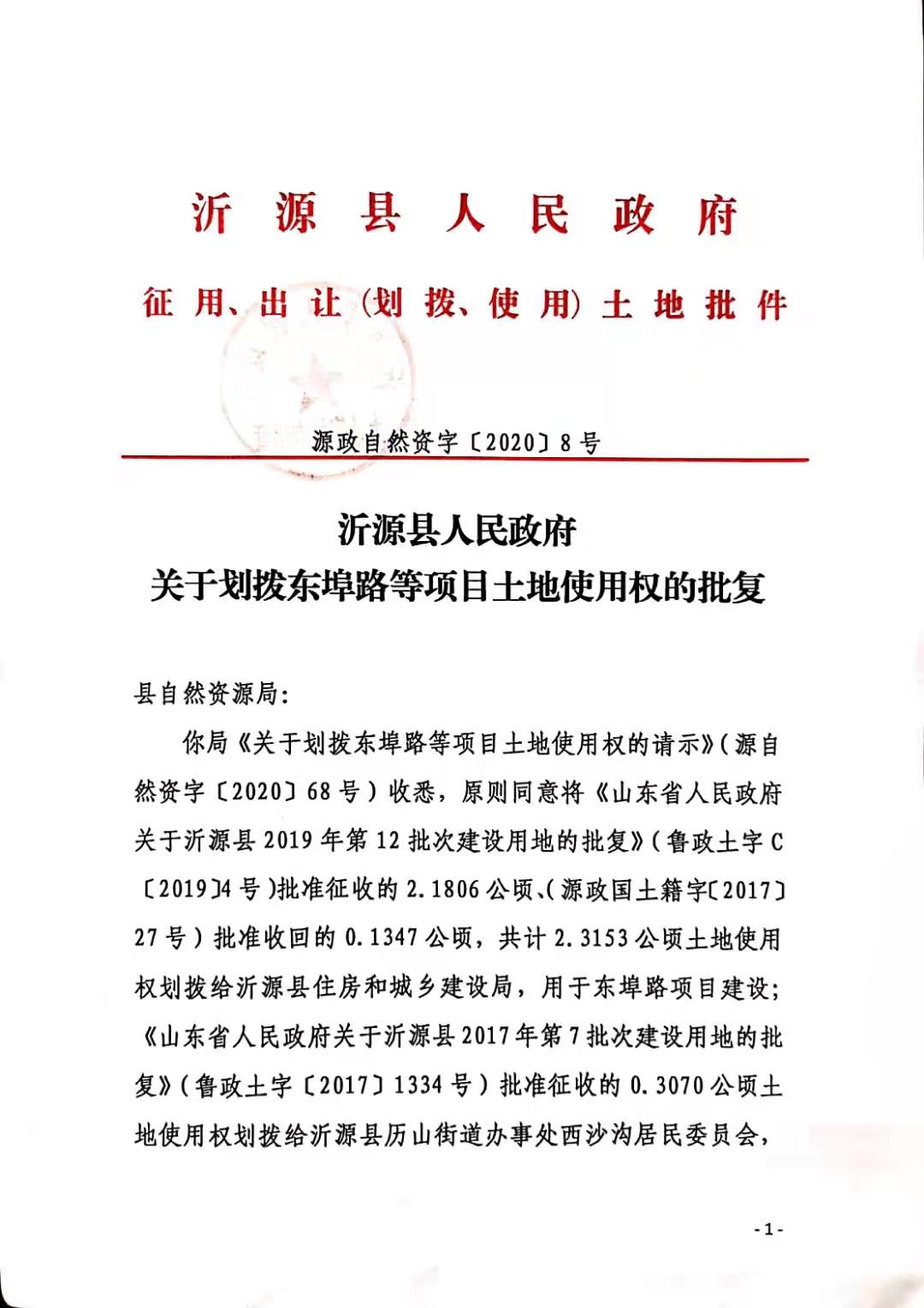 沂源县人民政府关于划拨东埠路等项目土地使用权的批复