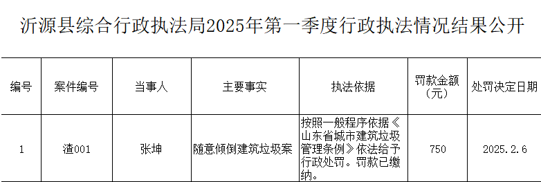 沂源县综合行政执法局2025年第一季度行政执法情况结果公开