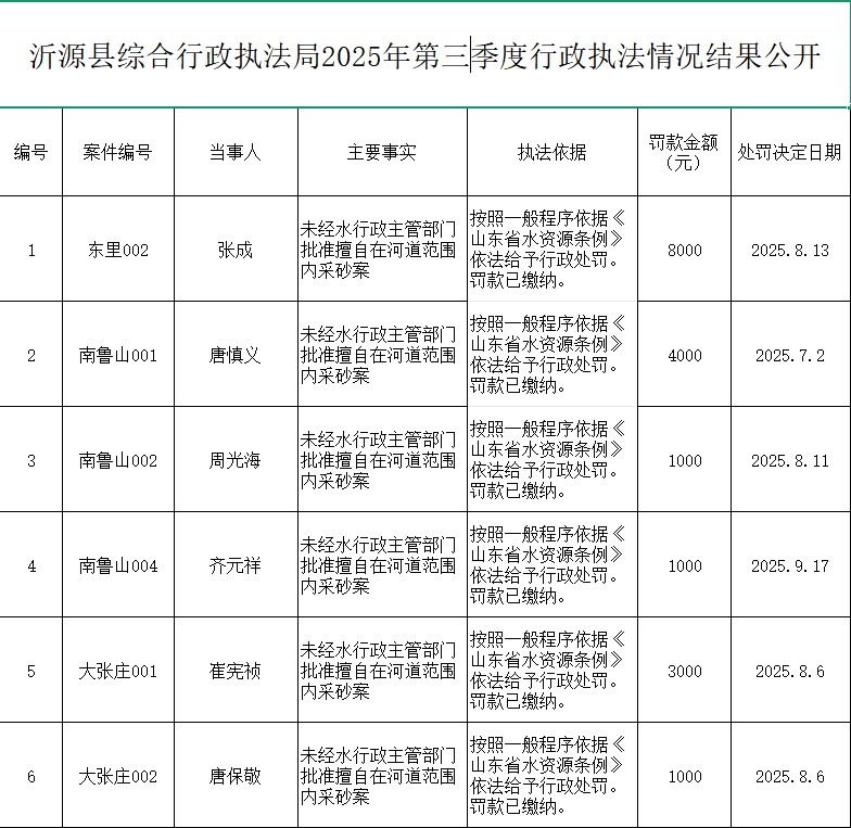 沂源县综合行政执法局2025年第三季度行政执法情况结果公开