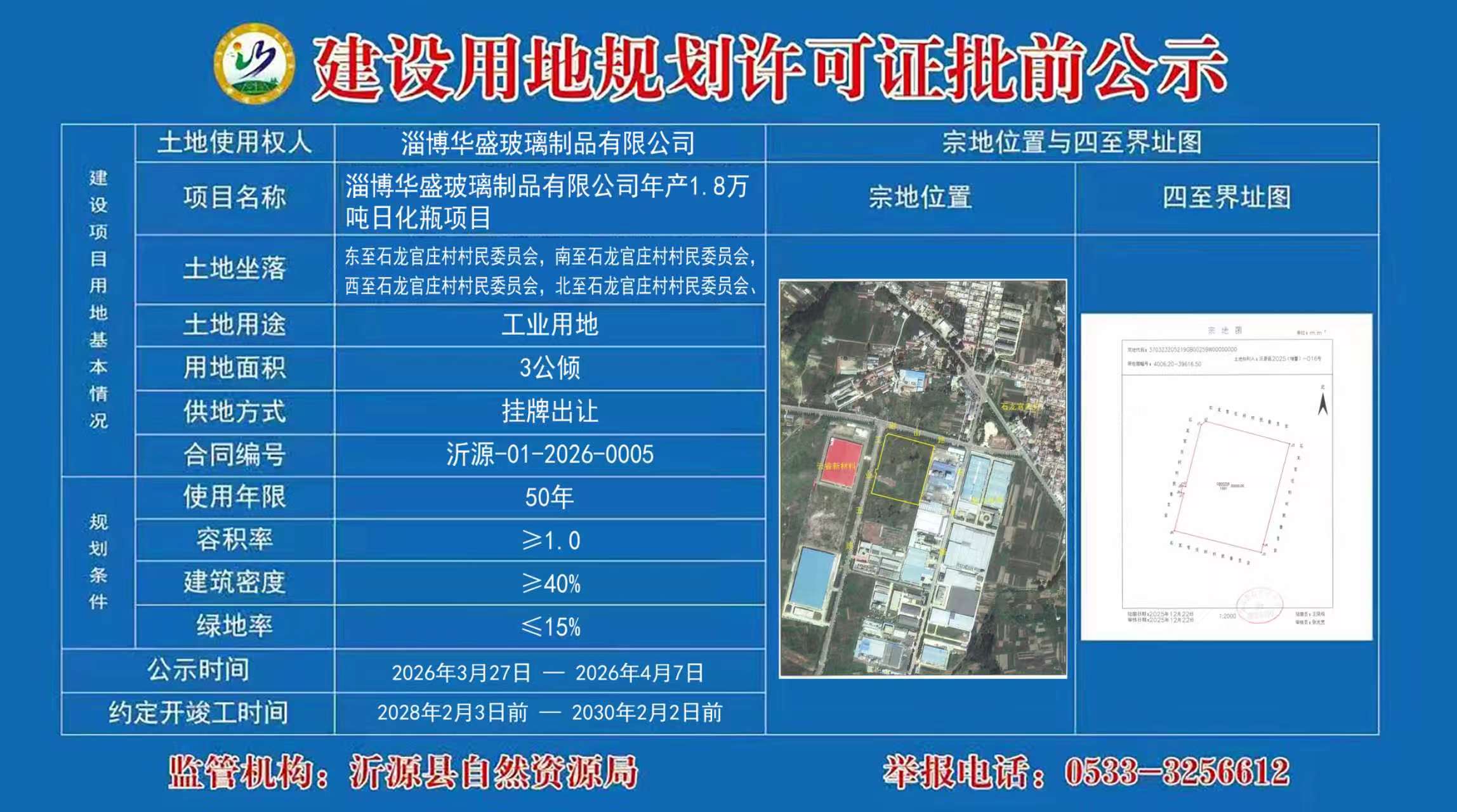 建设用地规划许可证批前公示【2026】淄博华盛玻璃制品有限公司年产1.8万吨日化瓶项目