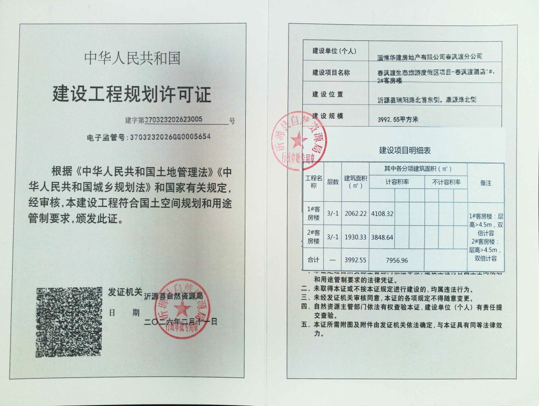 建设工程规划许可证批后公示【2026-5】淄博华建房地产有限公司春沨渡分公司:春沨渡生态旅游度假区项目-春沨渡酒店1#、2#客房楼